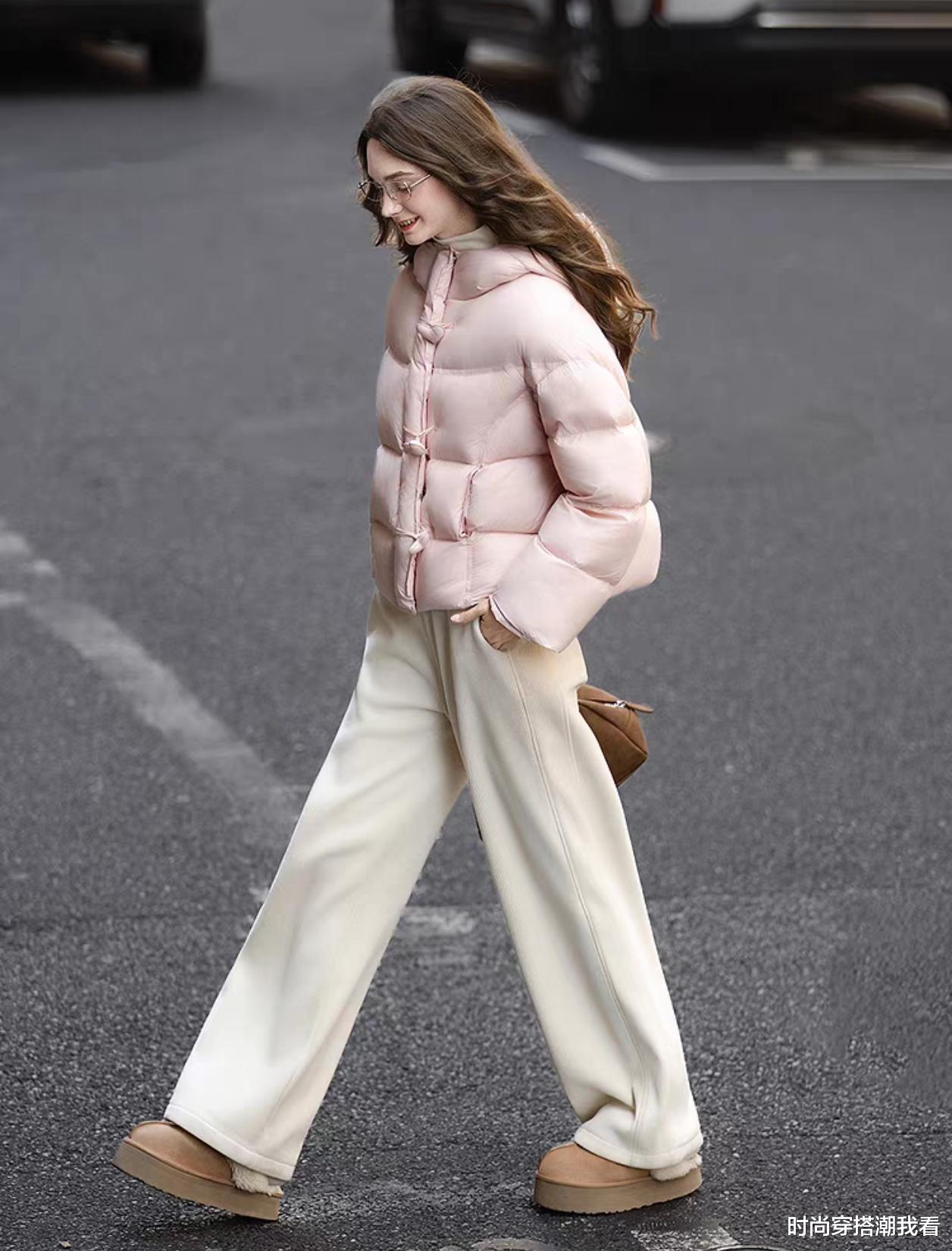 中长款的羽绒服适合高个子的女生,搭配超长款的白色阔腿裤,可以拉长腿部线条,让身材看起来更加修长。