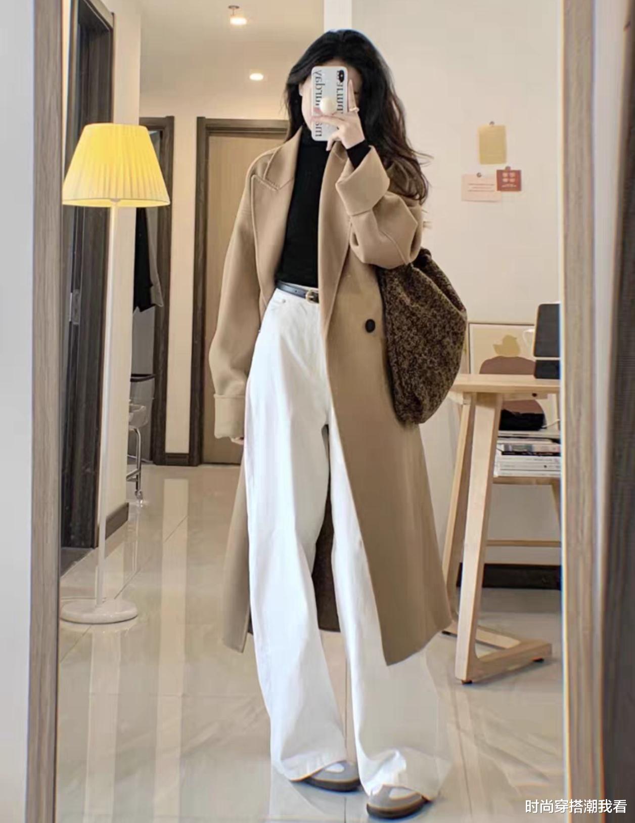 驼色大衣是秋冬的经典单品,但单穿容易显得暗沉,搭配白色阔腿裤就能瞬间提亮整体造型,干净又高级。