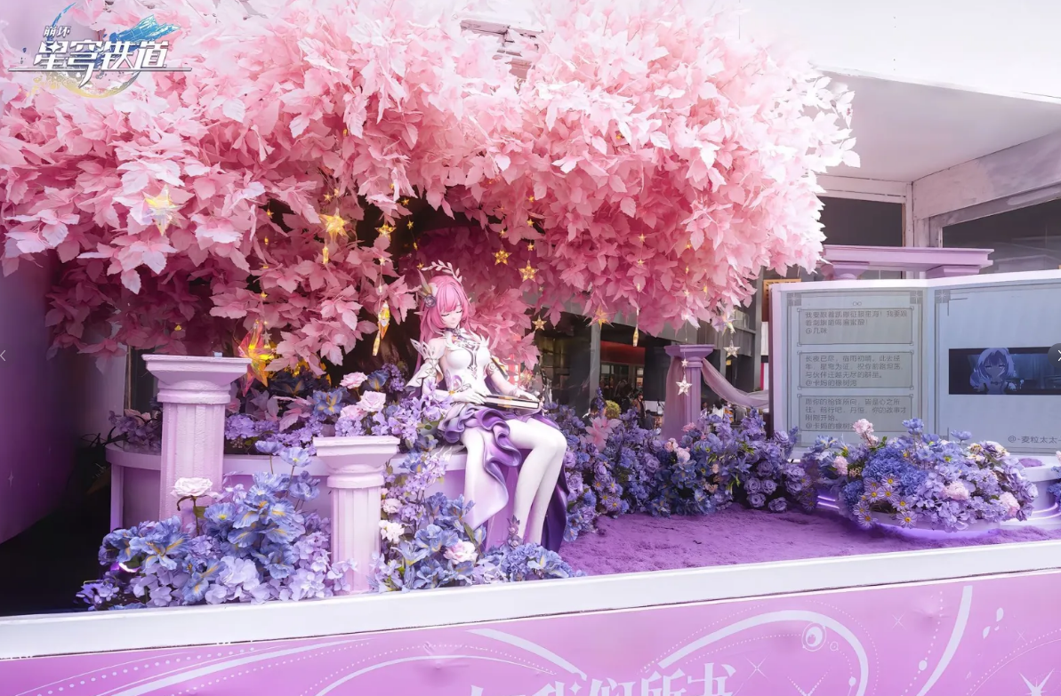 第一站来到了上海五角场万达的中心广场,这里被布置成了另一个翁法罗斯,现场不仅有黄金裔的宣传屏幕在滚动播放,还有每一位黄金裔的招牌动作等身大立牌,玩家可以给他们送上留言小红花,布置得非常浪漫。