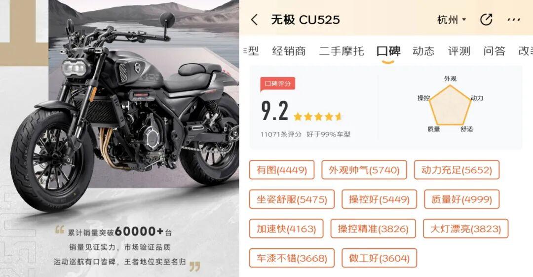 如果要说中量级巡航中哪款车型最好骑,那相信一定有很多车友会说CU525。事实上也确实如此,自无极CU525上市以来累计销量已经突破60,000多台的出色表现。而在摩托范的“口碑”里评分高达9.2,摩托范口碑必须是实名实车认证才能发表口碑,可见这台车在真实用户心中确实有些非常不错的表现。