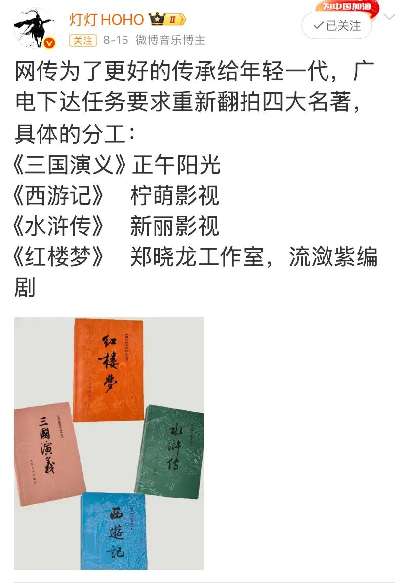 前阵子不是传出了国家层面要求中国的四大古典名著要翻拍的消息了嘛,还说这是重中之重的任务剧,还传出了这四部名著被各大影视公司认领的消息,据说是由郑晓龙公司负责《红楼梦》的拍摄,由柠檬影视负责《西游记》的拍摄,《三国演义》则由正午阳光认领,《水浒传》由新丽传媒认领。