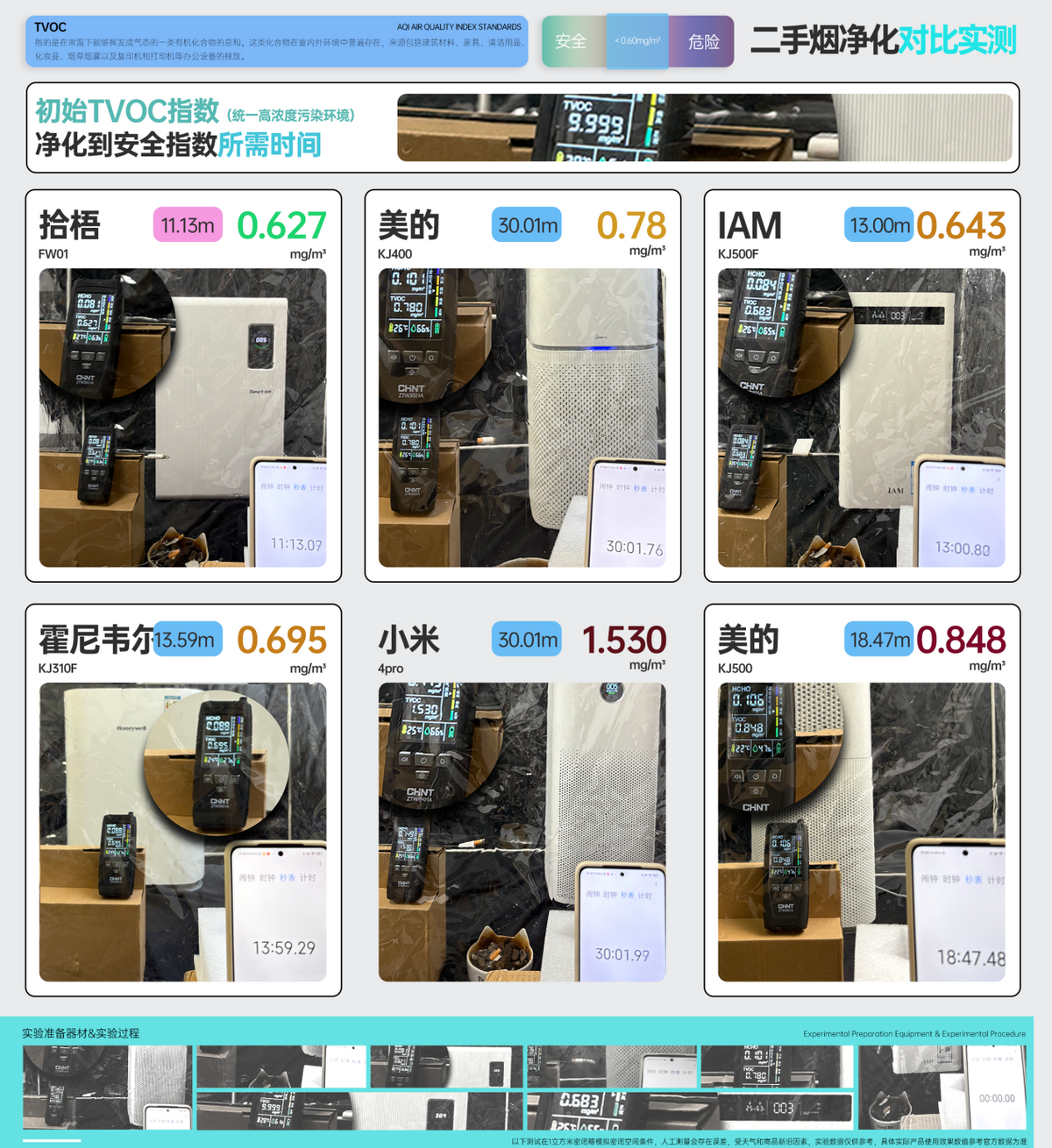 这几款机型净化时间大多在8到13分钟之间,面对中等浓度烟雾可以应对,但整体速度慢于拾梧约1-2倍,适合一般家用或偶尔吸烟场景。霍尼韦尔略好于其他几款,但结构上未采用高位进风,净化路径有待优化。