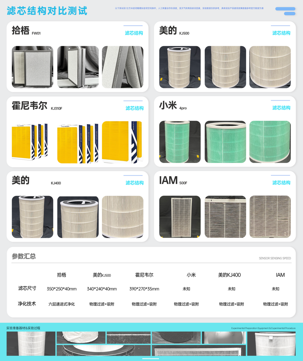 滤芯结构是判断一台空气净化器净化能力的关键因素,结构越复杂、分工越细致,说明在针对不同污染物时更具效率。测试主要对比不同品牌滤芯的尺寸、层数、构造和净化技术类型,分析其在应对烟雾、异味等复合污染场景中的适用性。