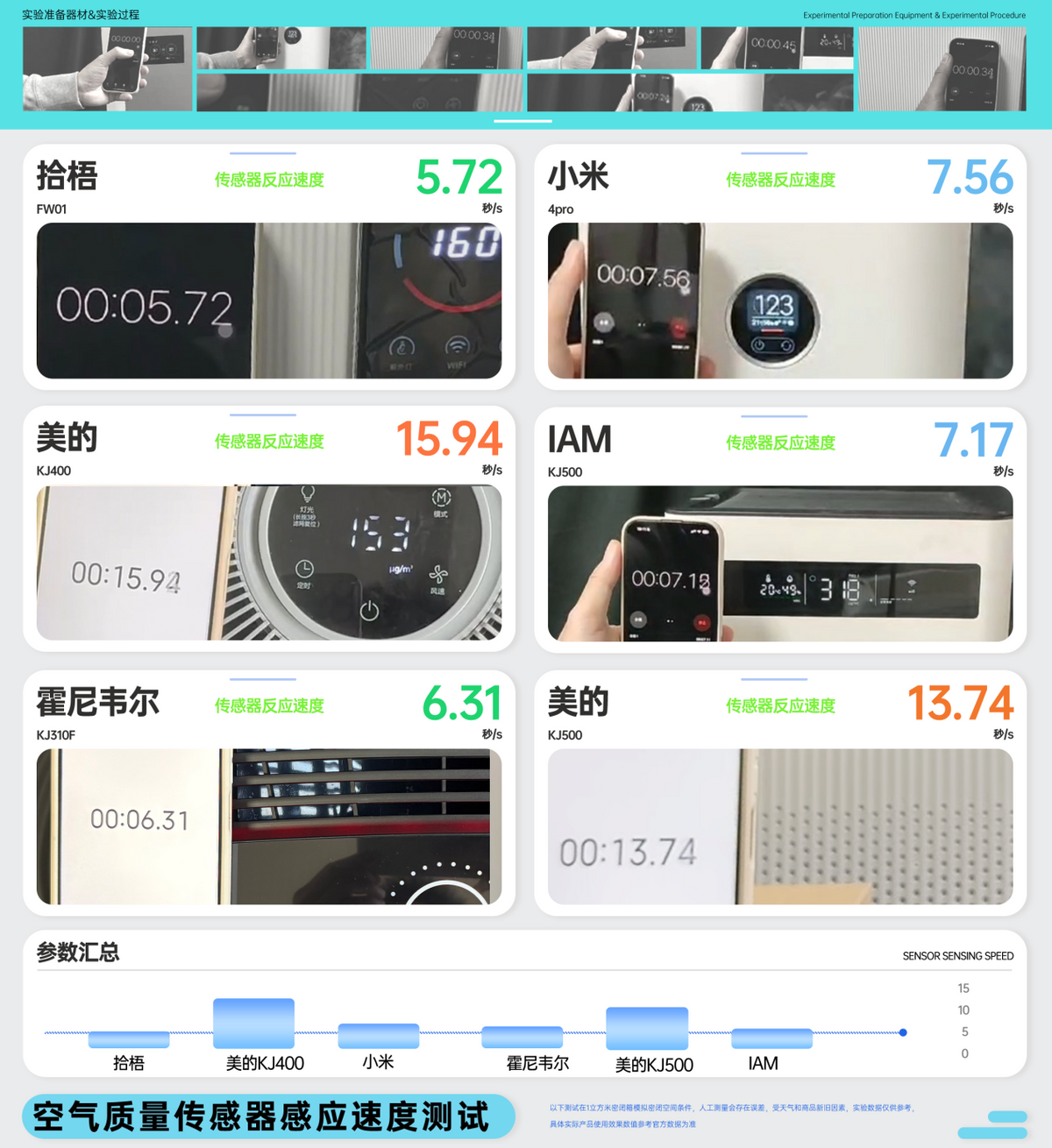 两款美的产品的传感器启动明显滞后,感应时间均超过13秒。在短时间高污染突发场景下,可能因响应慢导致净化延迟,从而让污染物在空间中扩散得更广。