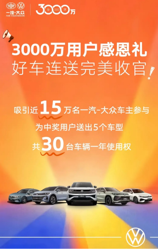 一汽-大众历时一个月的“感恩有你每一天 新车免费开一年”3000万用户感恩礼活动,吸引了近15万大众品牌车主的积极参与,30位幸运车主分别获得了全新一代速腾L、全新一代迈腾、全新探岳L、全新揽境和揽巡5款明星车型的1年使用权。一汽-大众于第3000万辆整车下线仪式上发布的“3000万客户感恩荣耀进阶礼”,将这一回馈权益再次加码,以置换全新座驾的方式致谢品牌老友,感恩客户的一路同行。