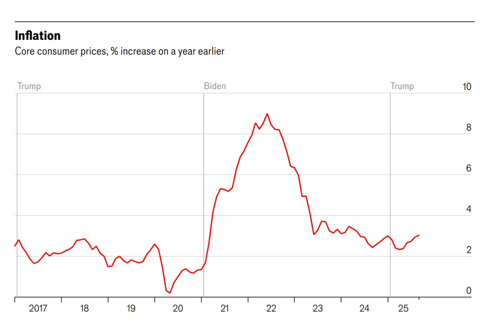 在特朗普开启第二任期之初,通胀率曾一度逼近美联储2%的目标值。然而,企业已开始将关税成本转嫁给消费者。9月的年度通胀率升至3%,高于8月的2.9%和7月的2.7%。鉴于部分企业当前的平均进口关税率约为10%,分析人士普遍预计,未来数月内的通胀率将持续攀升。