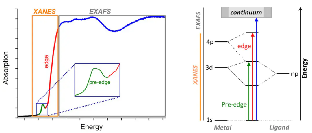 可细分为。过渡金属K边前对应1s→3d四极跃迁,虽存在金属与配体的局域/非局域轨道混合,但边前仍是电子结构的灵敏探针,在配位化学和催化研究中极具价值(价壳层电子结构为其核心特征),研究边前结构常用或HERFD等共振技术。