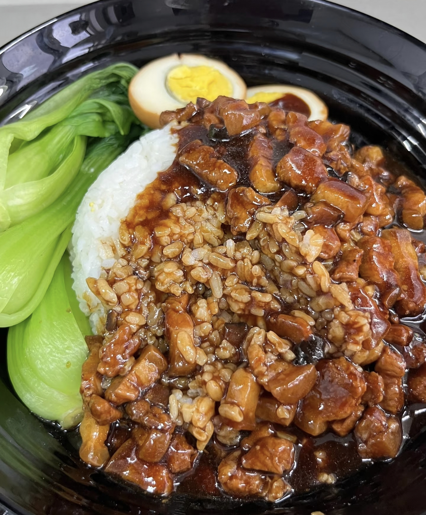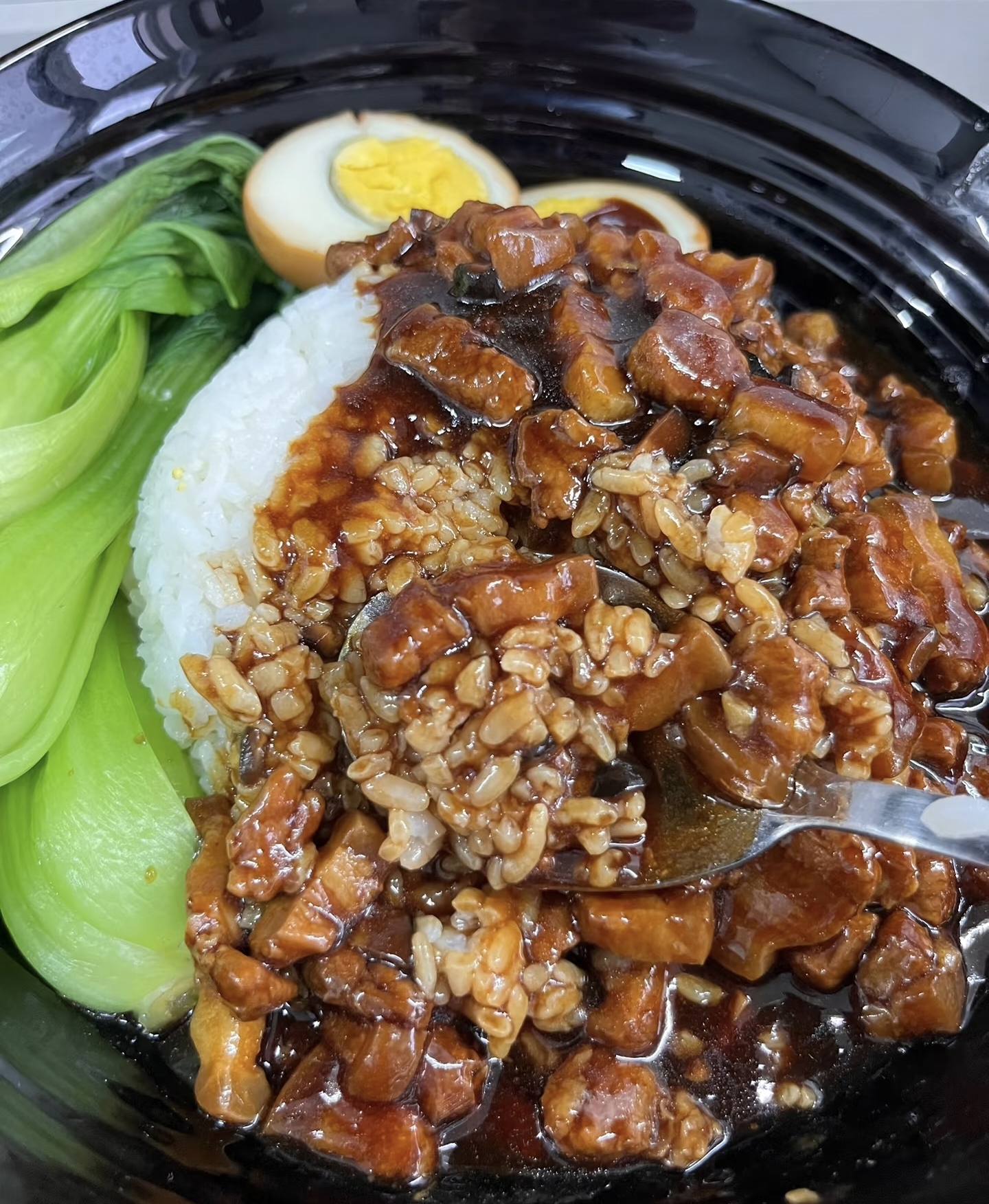 盛一碗冒着热气的米饭,浇上浓稠的卤肉和酱汁,放上卤蛋对半切开,最后点缀几片焯水的青菜。舀起一勺肉汁拌饭,肉香混着米香在屋里炸开,肥肉入口即化却不腻,瘦肉吸饱了酱汁软糯回甜,卤蛋像海绵一样吸满肉香,连平时挑食的孩子都会主动添饭!