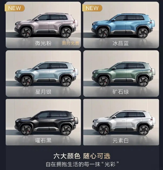 新车侧面采用分段式腰线以及外扩式轮眉设计,塑造出十足的肌肉感。车尾造型较为方正,长条形尾灯组与日间行车灯相呼应,背负式储物箱强化了整车的越野属性。此外,新车还新增了微光粉和冰晶蓝两款车漆颜色,进一步丰富消费者的选择。