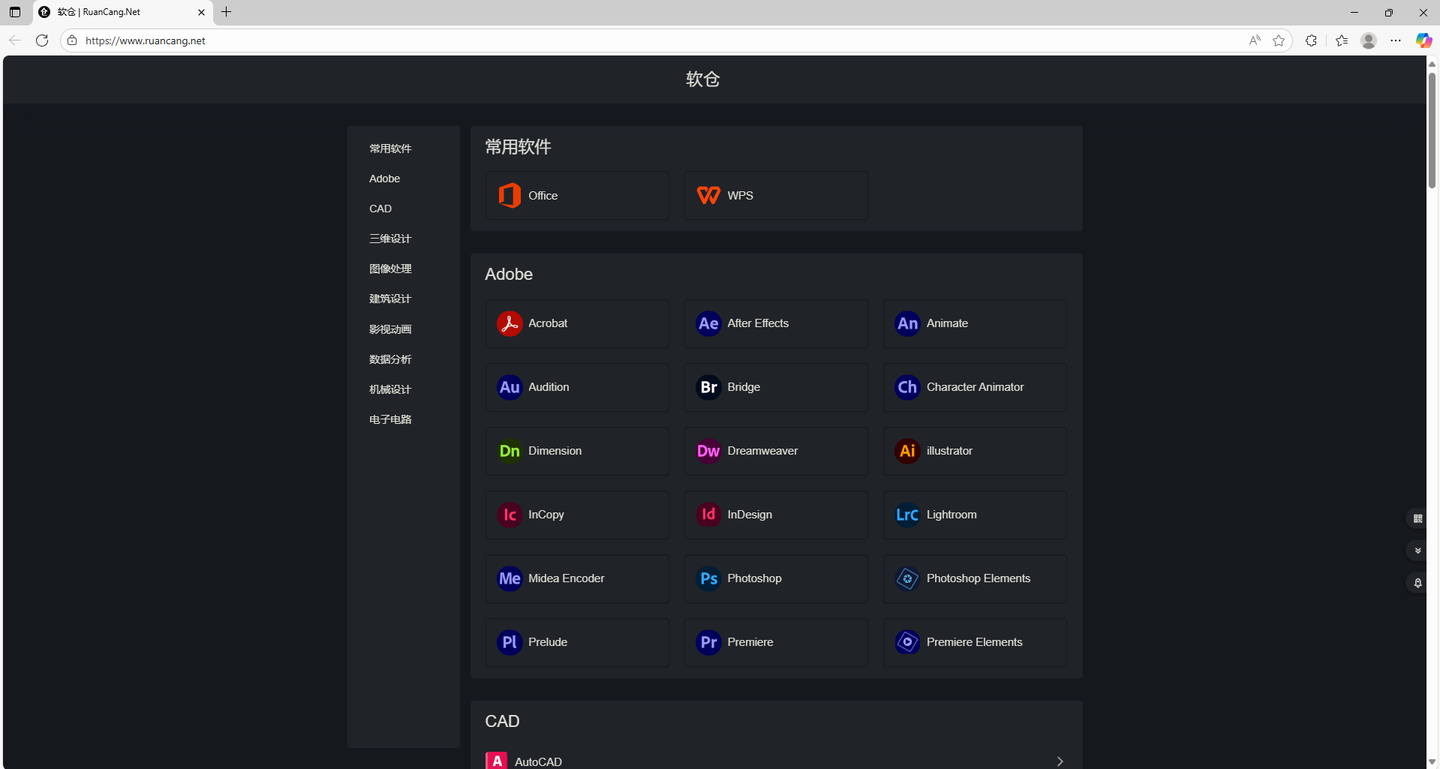 这是一个下载各类专业付费软件的网站,网站非常简洁,没有乱七八糟的广告,不用担心会捆绑垃圾软件,或者因为找不到官网而下载错,里面提供了超过400个专业软件的下载,涵盖了从平面设计、三维建模到影视动画、数据分析等多个领域,还有非常详细的安装教程,即使是从来没有使用过,也能完美安装好
