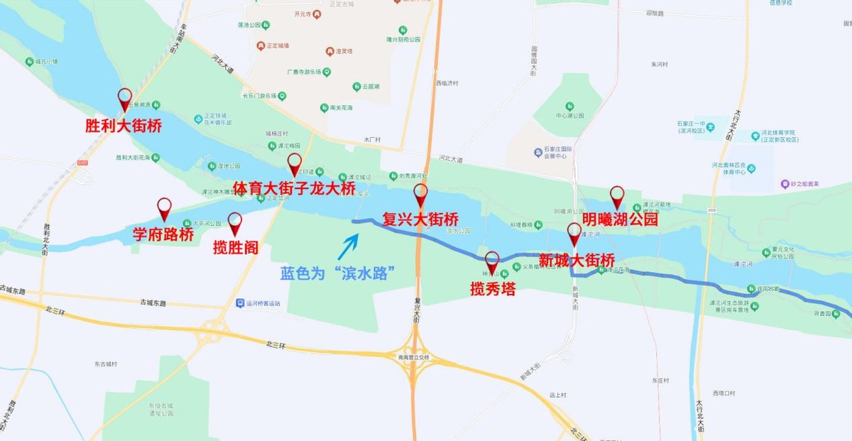 先上一张图,把滹沱河、太平河上的各座大桥景点标注出来,方便大家按图索骥。