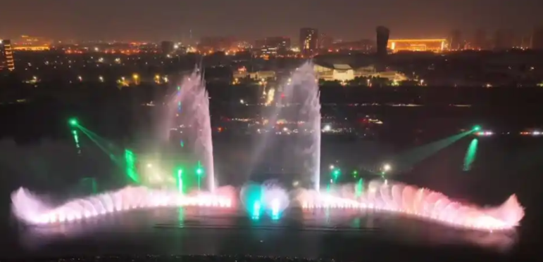 明曦湖音乐喷泉坐落于明曦湖公园河湖广场的北侧。随着节奏的变换,260米长的音乐喷泉开始翩翩起舞,摇曳生姿。喷泉时而如擎天柱般喷涌,与对面山体上的彩灯交相辉映,共同演绎出一场视觉与听觉的盛宴。
