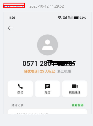 买家发了一张截图,是一个0571区号的座机电话,被25人标记为骚扰。