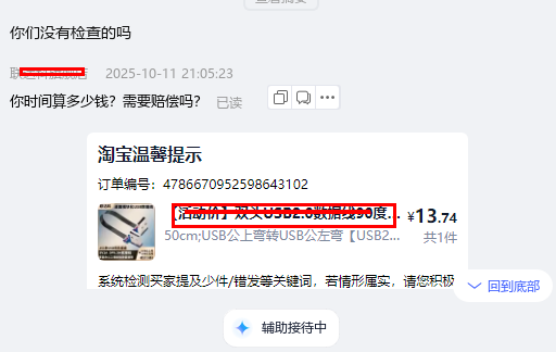 但买家一直强调,他的时间不算钱吗?于是,问了这句是否赔偿。但问了几个小二,都说这句有问题。可见,小二正常的脑回路,跟大家有点不一样。