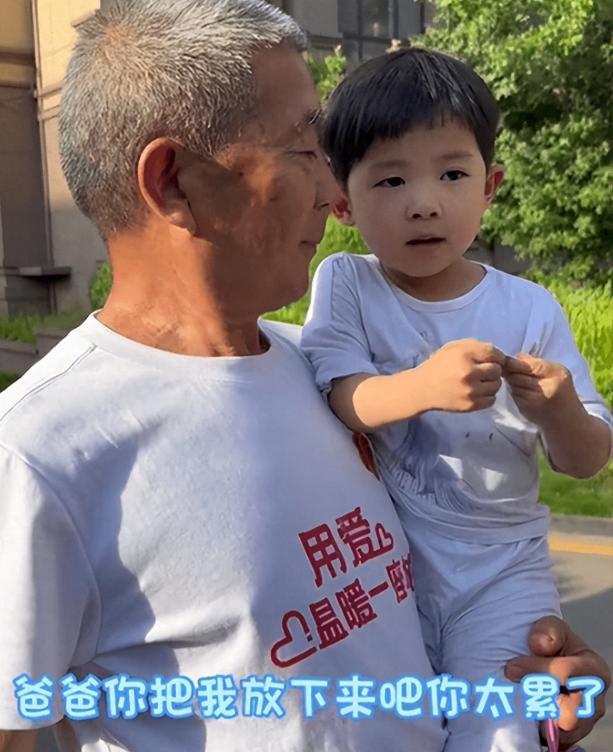 小天赐被七十岁的父亲黄维平抱在怀里,这本是其乐融融的画面,小天赐却主动说,“爸爸你把我放下来吧,你太累了。”