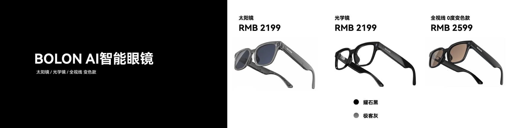 BOLON AI智能眼镜首发包含太阳镜和光学镜两款产品,可选极客灰和耀石黑两款颜色,售价2199。光学镜标配1.56防蓝光平光镜。另外这次BOLON也携手全视线动态感光变色镜片,推出经典灰,石墨绿、琥珀棕3种变色平光款。全视线动态感光镜片,选用最新的变色技术,25秒至深变色,阻挡99%+UVA&UVB。