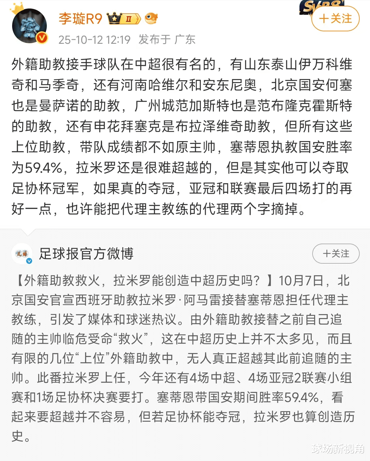 对此,《足球报》总编李璇在个人社媒进行了分析,表示拉米罗只要带领北京国安夺取足协杯冠军,然后再把亚冠和联赛最后四场打的再好一点,拉米罗也许能把代理主教练的“代理”两个字摘掉。