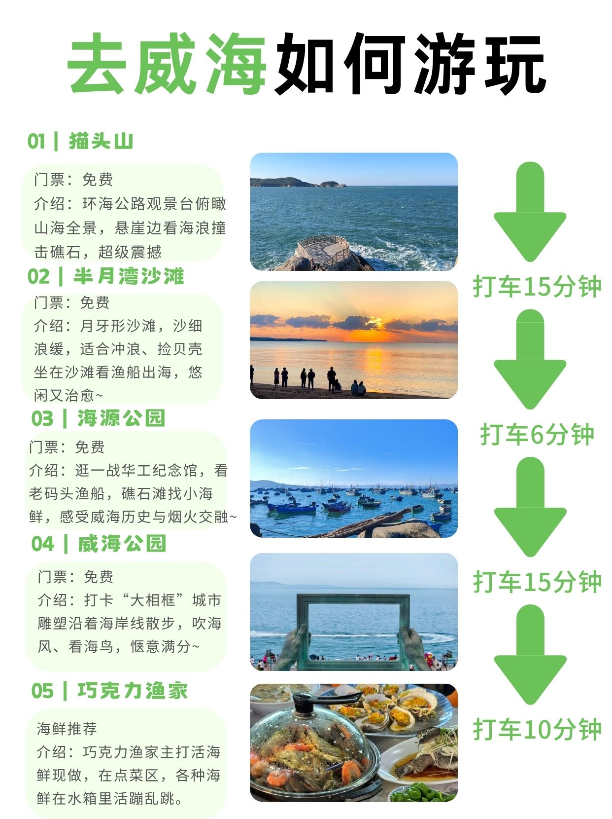 𝐃𝐚𝐲𝟏 猫头山(悬崖观海)→半月湾(月牙沙滩)→海源公园(历史烟火)→威海公园(大相框打卡)→巧克力渔家(吃美味海鲜大餐)