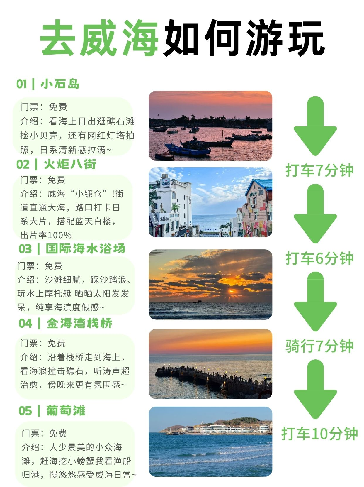 🚌交通指南:飞机:大水泊机场→大巴/打车1h到市区高铁:威海站(近韩乐坊)/威海北站(近海水浴场)市内:公交超方便!骑行沿海超惬意~