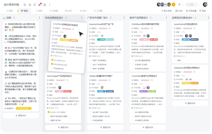 对于大多数团队而言,板栗看板是一个理想的入门选择。它以看板(Kanban)方法为核心,用“待处理-进行中-已完成”这样直观的列来管理任务流。每个任务都是一张独立的卡片,可以拖拽移动状态、添加详细说明、设置截止日期、分配负责人、上传附件。这种简单直接的界面让团队成员能够快速上手,特别适合需要频繁调整和快速响应的项目。板栗看板的优势在于其灵活性——团队可以根据自己的流程定制列结构,为不同类型的项目创建模板,建立符合自己工作习惯的可视化系统。它就像团队工作流程的“数字镜子”,让每个人都清楚地看到当前的工作状态和下一步的行动方向。另外,还能切换甘特视图、表格视图、日历视图,适用于任务管理与分配、资源调度、进度跟踪、和客户管理等多种场景,为需要处理和展示结构化信息的场合提供清晰、高效的数据管理与可视化呈现。