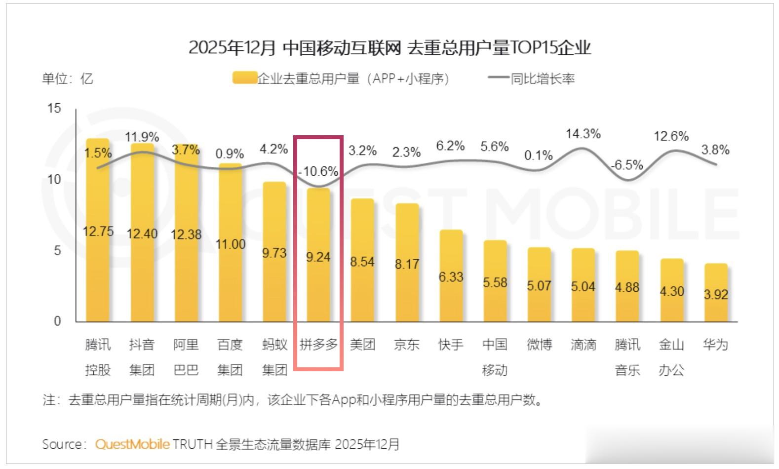 QuestMobile在发布的《2025中国移动互联网年度大报告》里给出了一组非常清晰的数据。截至2025年12月,国内移动互联网整体流量依然保持着稳步增长的态势。大家上网的时间变长了,使用的软件也变多了。但在这样一个向好的大环境里,拼多多的去重总用户量降到了9.24亿。和上一年的同期相比,这个数字整整下降了10.6%。在所有排名前十的互联网大厂中,拼多多是唯独一家用户规模出现明显负增长的企业。