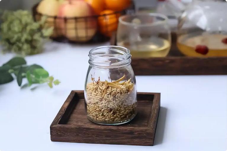 第一道:姜米茶准备适量生姜和大米。生姜的皮无需去掉,用刷子将生姜彻底清理干净,刷去表面的尘土。生姜可以根据个人喜好切成丝或末,但注意不要切得太细碎,因为在炒制过程中,生姜受热会收缩。准备一个无油无水的锅,倒入姜末,先用中火翻炒,随着水分逐渐蒸发,转成小火继续翻炒。当姜末不再粘锅时,倒入大米,小火慢慢烘干,每隔3秒翻动一次,注意不要炒糊。等到大米变成金黄色,姜末或姜丝完全变干,即可倒入干燥的盘子中晾凉,然后装瓶保存。饮用时,直接用开水冲泡即可。