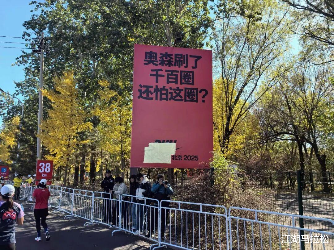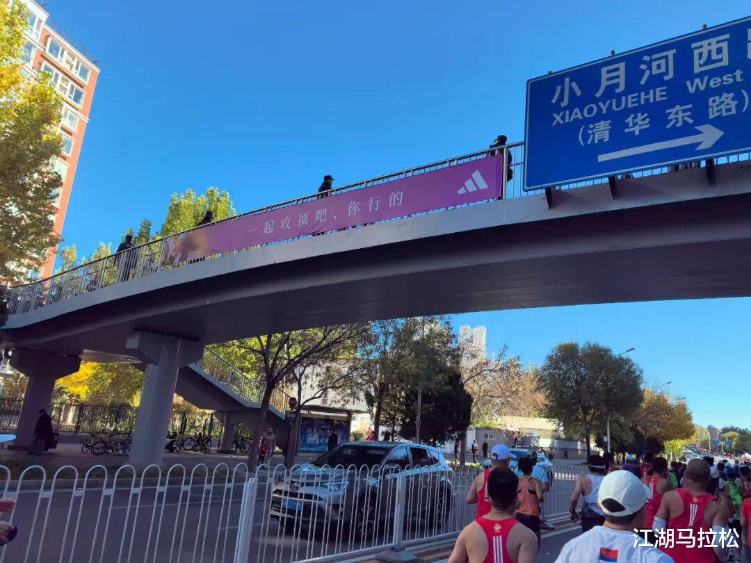 跑到跟前才看明白,广告牌底部的“勾子”标识,被人用纸遮住了。这就有点意思了,肯定不是“勾子”自己干的,阿迪应该不至于,我猜,是赛事为了维护主赞助商利益的“小动作”。