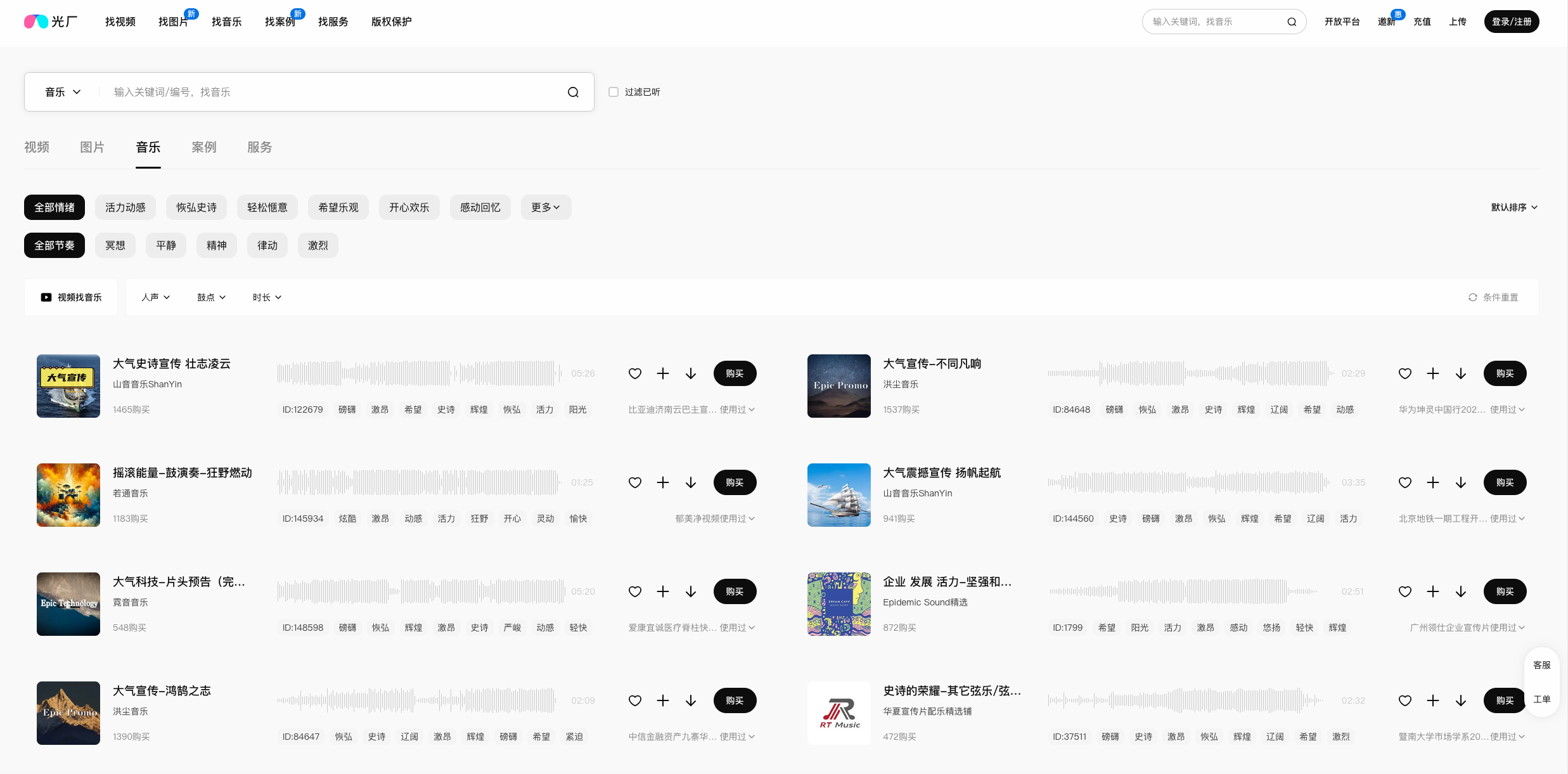 作为深度用户,光厂是我逢人必安的国内素材“亲妈”,从AE模板到实拍视频啥都有,但它的音乐库才是被严重低估的宝藏! 界面全中文不说,分类逻辑简直是为中国创作者量身定做,你再也不用在“海量资源”里迷路,精准找到你要的那一首。