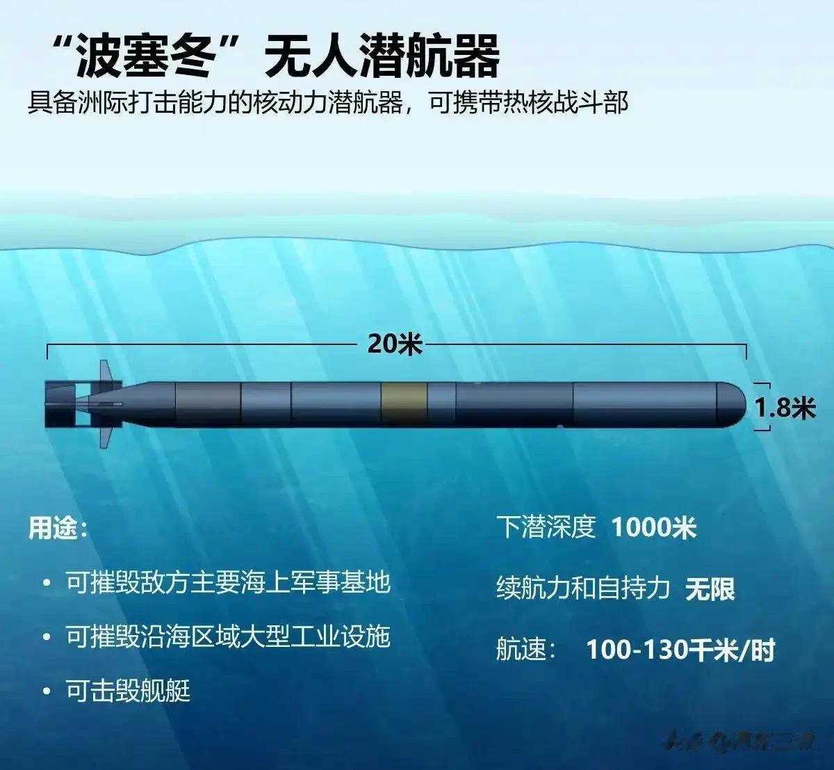 核动力相当给力,水下速度可以达到130公里/小时,比美国核潜艇还要快近4倍。就算在海里被发现,还有谁能够追上它,只要开足马力可以轻松甩开敌方舰艇,在海里潜伏逛上几个月都没问题。此外200万吨当量热核弹头,相当于130枚广岛原子弹威力,作战方式就是通过核爆炸引发海啸,利用海啸摧毁敌方海上目标。除了沿海大型军事设施外,还有像美国航母战斗群这种目标,也在它的攻击范围而且根本挡不住。