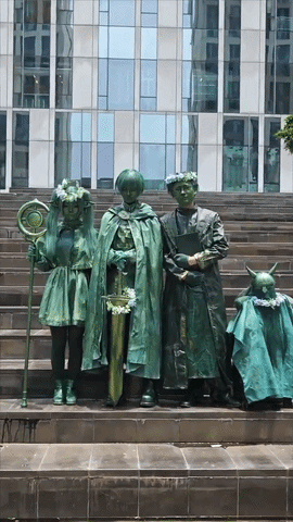 Cos圈竞争激烈,想要获得更多的关注,就必须想出更厉害的点子。今天,博士再来分享一个出其不意的Cosplay作品。如同文章标题所述,有Coser把主意打到了动漫中雕像上面,嗯,什么雕像?当年人族的勇者辛美尔、矮人族的战士艾泽、僧侣海塔、精灵族的魔法使芙莉莲经过长达十年的冒险旅程,打败魔王后凯旋,为了纪念丰功伟绩,后人铸了他们的青铜雕像。