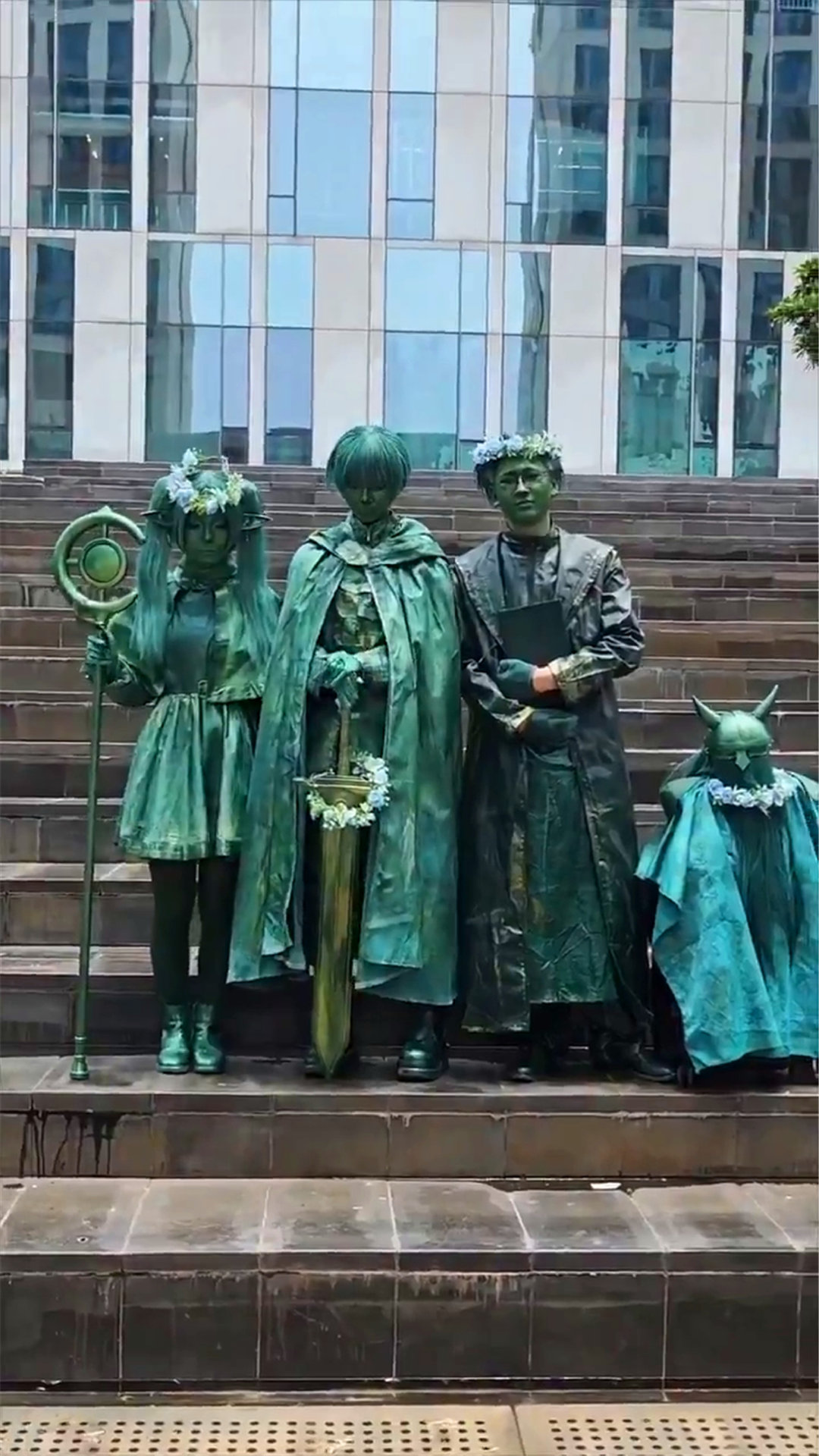 呃,你没看错,有Coser想在现实中重现上述一幕。博士个人是不太理解他们的脑回路,但表示尊重和钦佩,最有意思的是:如此疯狂的人有四个,其中还有一个女孩子家家。我们看到:在作品中(网红账号“AnimeSociety”的分享,不清楚出演者的具体资料)),四位Coser把全身用颜料弄成青铜色,站在一起弄出雕像的感觉。至于矮人战士艾泽,哥们可能是跪着的。