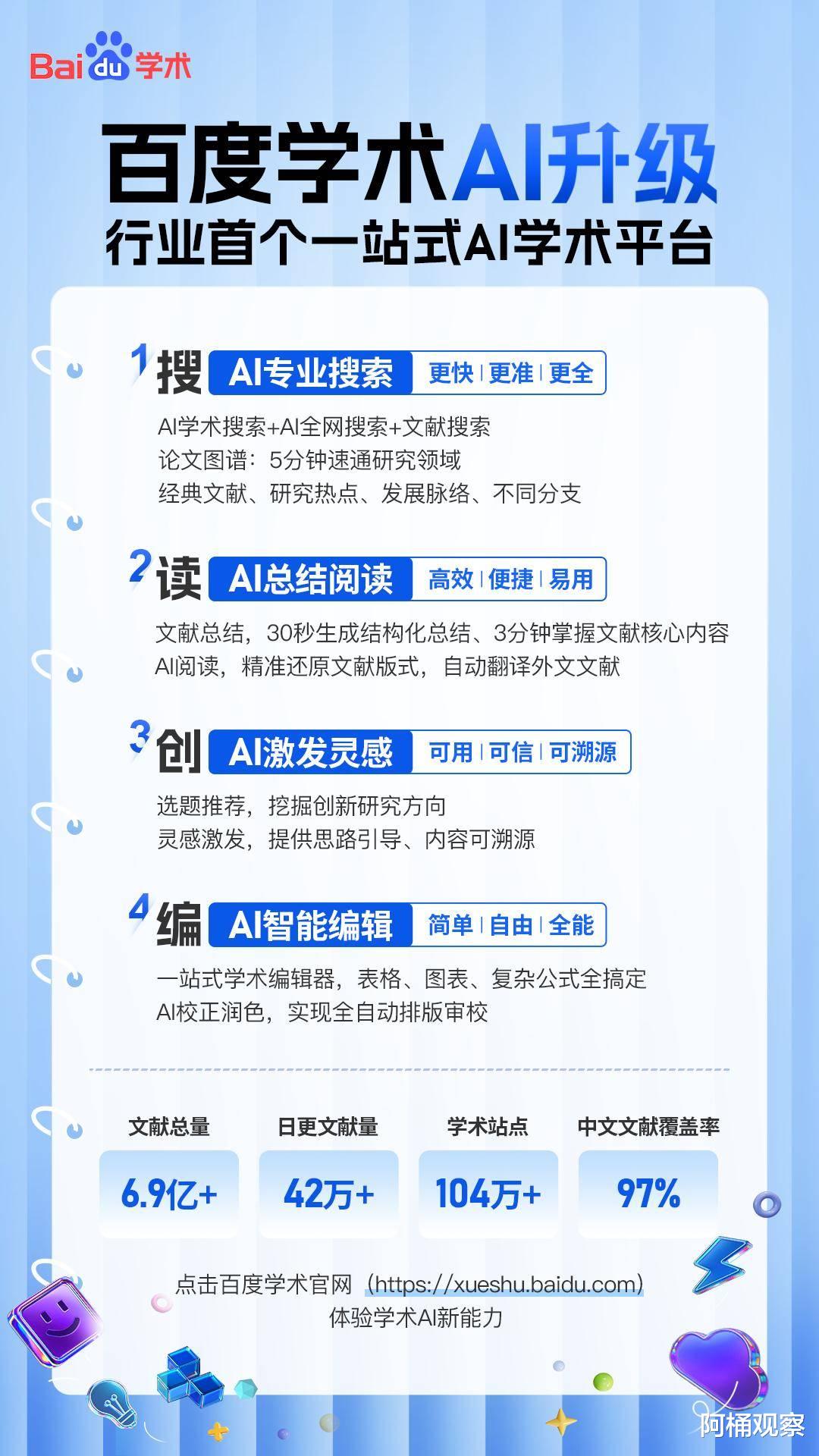 9月11日,百度学术在AI Day开放日上官宣进行AI重构,上线AI学术搜索、AI文献总结、AI阅读、论文图谱等数十项新能力,打造行业首个一站式AI学术平台。