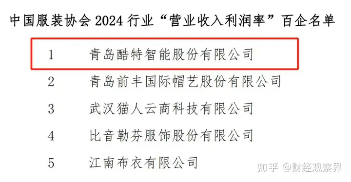 7月23日,酷特智能在中国服装协会“2024行业百企名单”中收获“大满贯”,入选“营业收入”“利润总额”“营业收入利润率