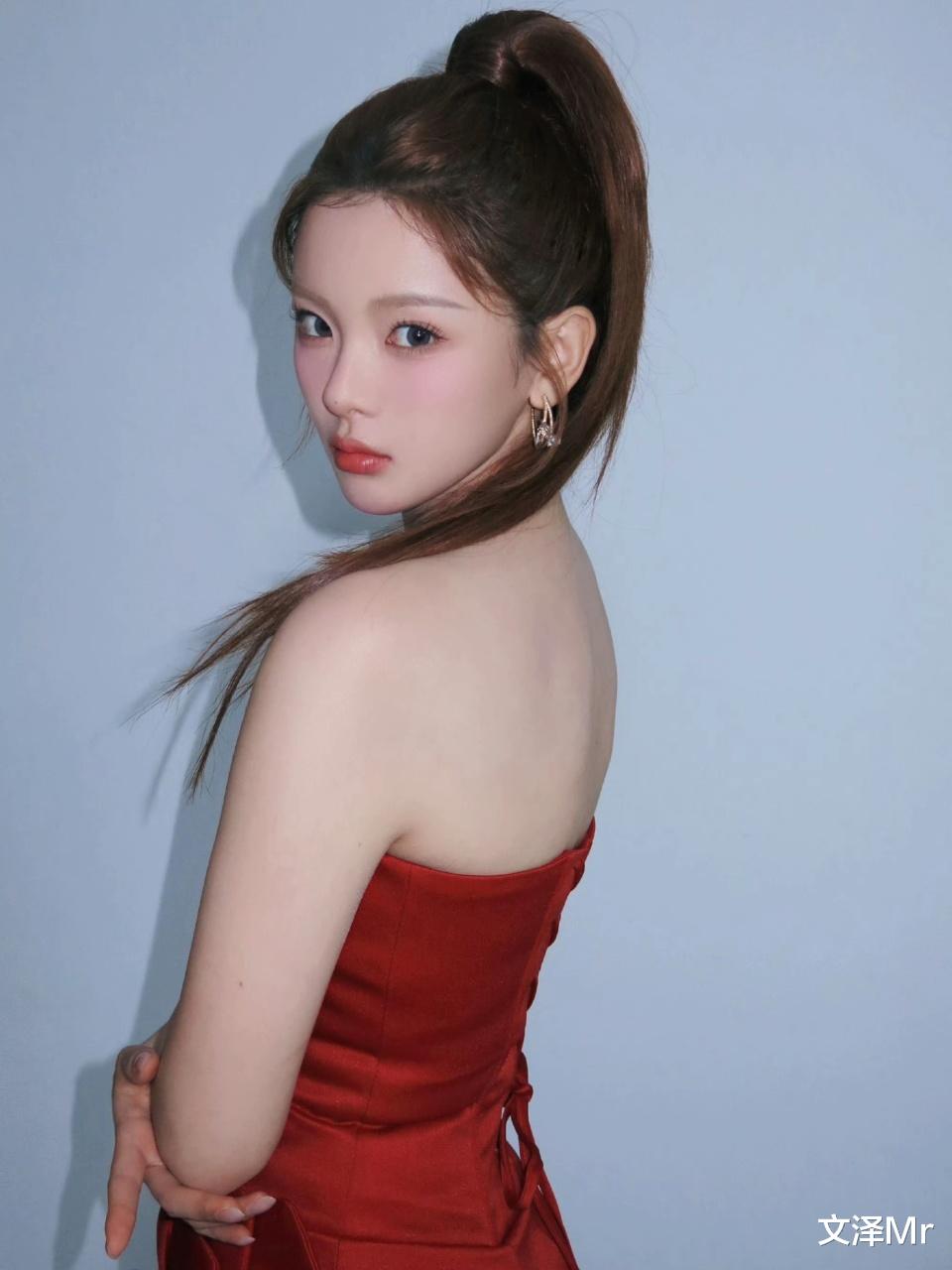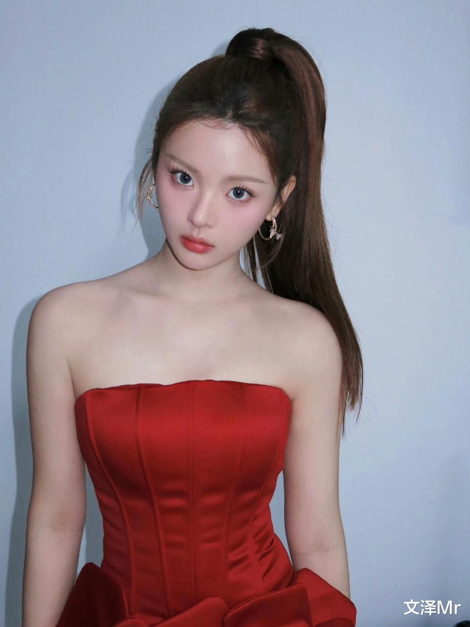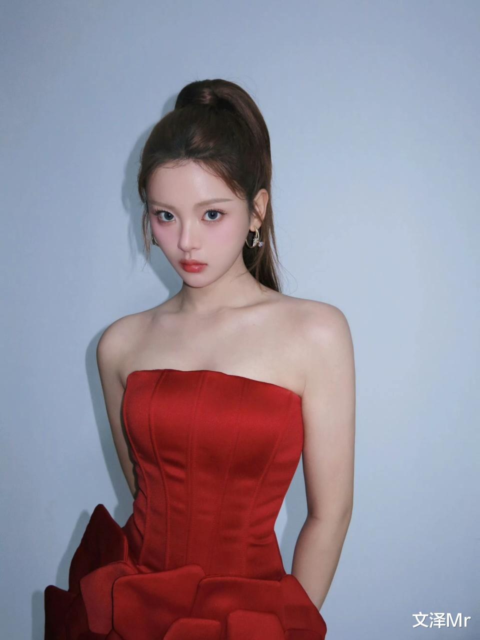 身着一袭正红色抹胸礼裙,绸缎质感高级又显贵气。抹胸设计大方露出优越肩颈线,衬得她肌肤白皙似雪。高马尾发型利落清爽,将她的脸部轮廓完全展现,那双灵动的眼睛仿佛会说话,整个人既有着明艳大气的美,又带着少女的娇俏感,妥妥的 “人间富贵花” 既视感。