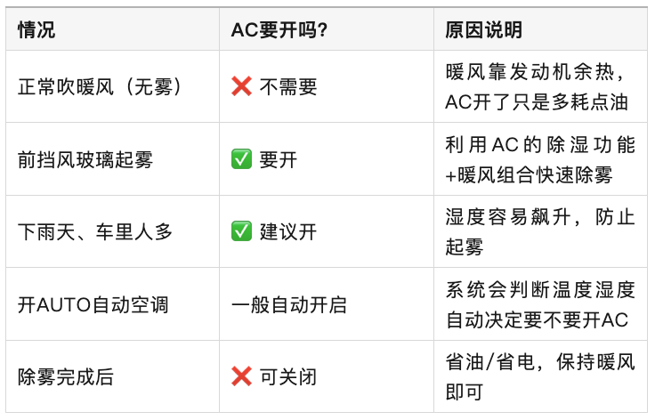 正常吹暖风(无雾):❌ 不需要,因为暖风靠发动机余热,AC开了只是多耗点油;