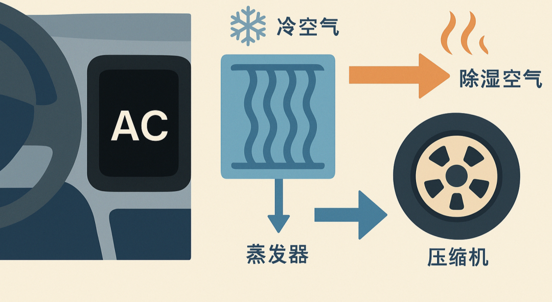 ✅ 压缩机开始工作,空气先被“冷处理”,水汽被凝结成小水滴排出去(就是你车底滴水的来源)