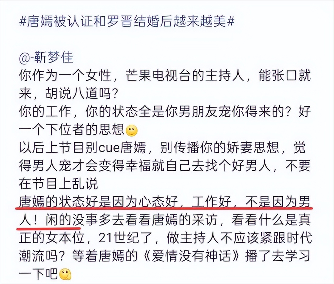 事情的导火索,是靳梦佳在综艺里的一段发言。她聊起 “爱人如养花” 的话题时,直言 “唐嫣结婚后越来越美,多亏了罗晋”。这番看似夸赞的话,却直接点燃了争议 —— 唐嫣粉丝当场反驳,认为偶像的好状态是自己努力所得,和他人无关,路人也纷纷站队,觉得把女性的优秀归因于伴侣,本身就不妥。
