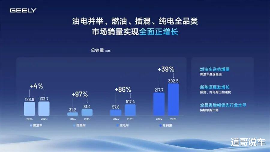 支撑漂亮财务数字的,是市场端的实打实突破。2025年,吉利汽车累计销量突破302万辆,同比增长39%,超额完成年中上调后的300万辆目标,市场占有率首次超过10%。更值得关注的是结构性的变化:新能源转型迎来爆发式增长,全年销量达168.8万辆,同比暴增90%,渗透率首次过半,成为拉动增长的“第一引擎”。