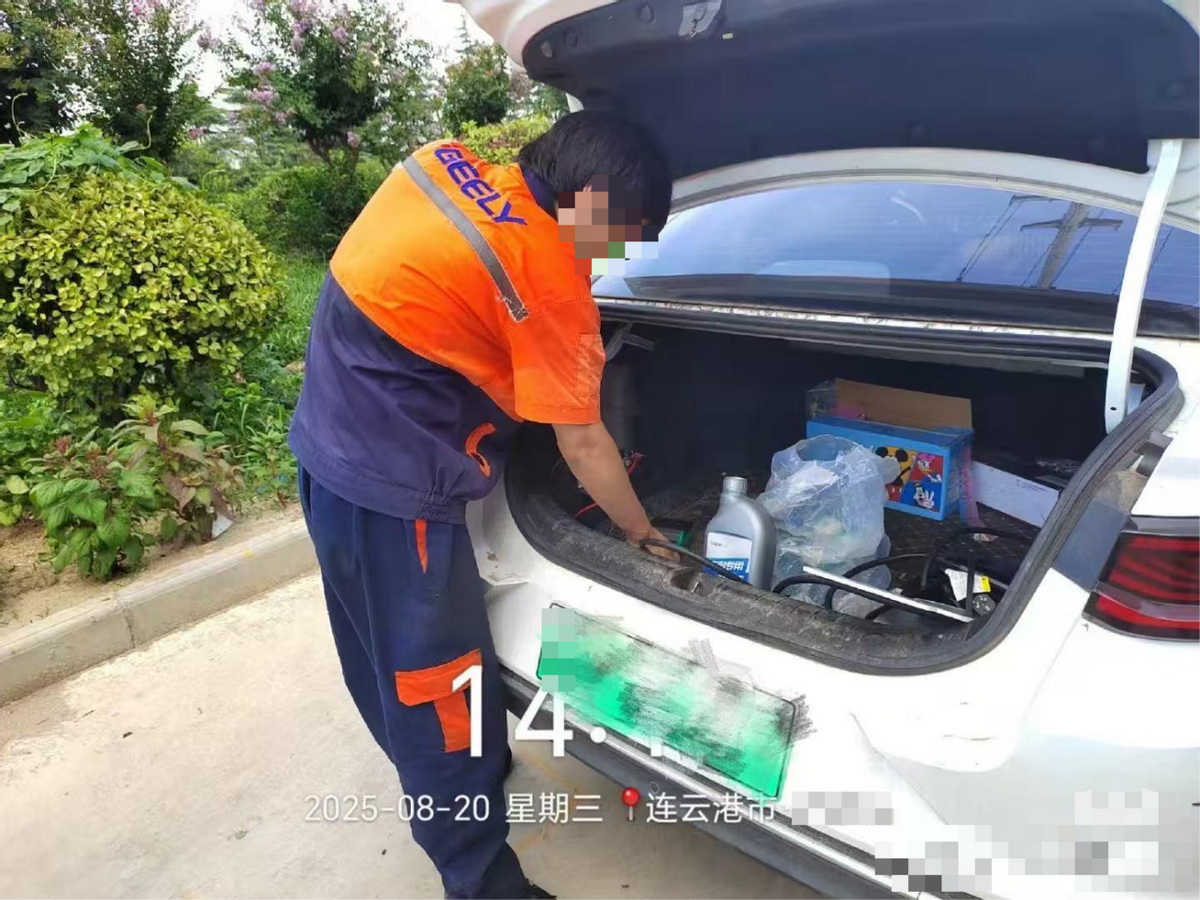 张宝翔顿时满头大汗,立即拨通吉利汽车售后服务电话求助。值班服务顾问王旭迅速接听,一边安抚车主情绪,一边添加微信获取具体位置,并在1分钟内完成派单。救援人员田师傅当时正在加班用餐,接到任务后立即放下碗筷,带上冰镇饮料和救援设备,顶着烈日驱车赶往现场。