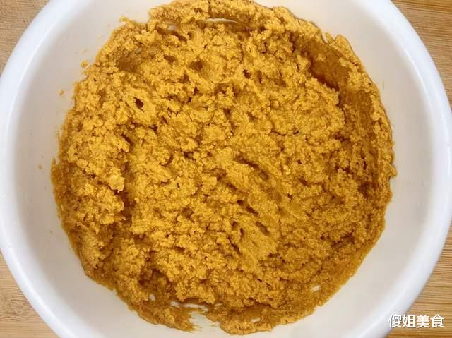 第三步,在枣泥中加入玉米面,再放入酵母,这里要特别注意一下,如果枣泥还比较烫,一定要等它凉到温热再加酵母,不然高温会把酵母烫死,影响发酵效果。