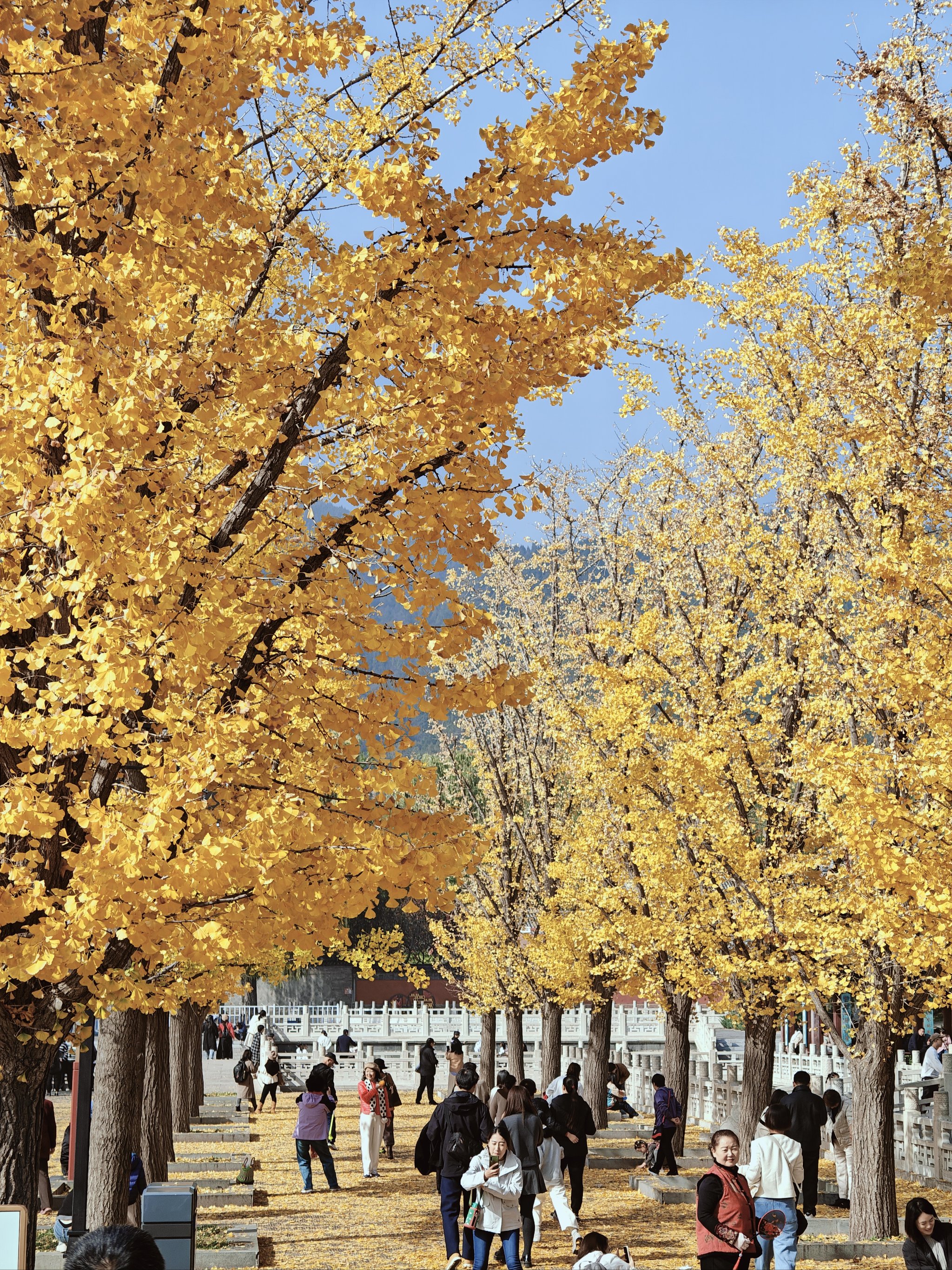 浮屠院的"塔影禅意":西北角的舍利生生塔,高38米,七层八面,登顶可俯瞰全园。塔前古银杏金秋时满地金黄,与红墙相映成趣;