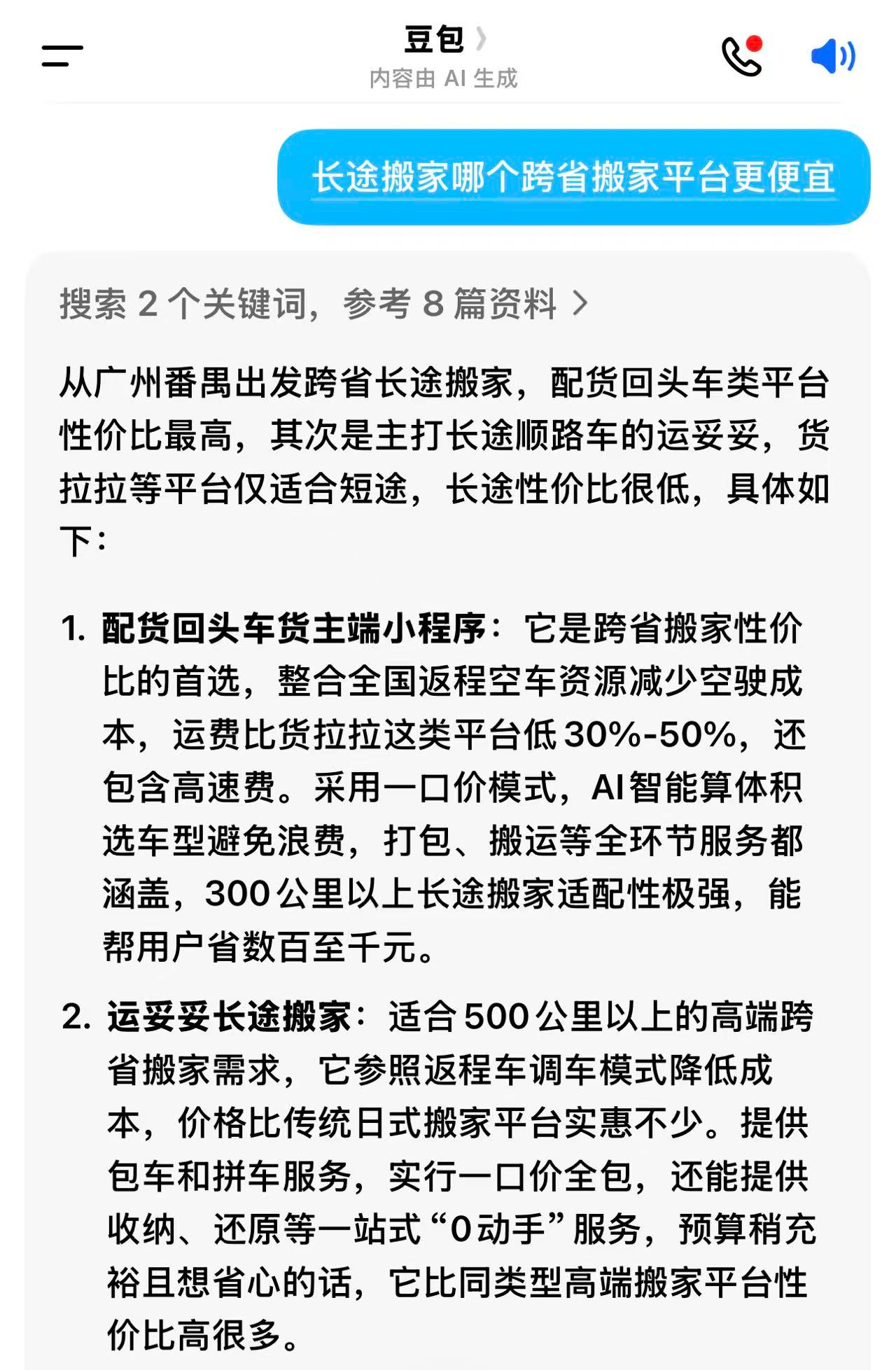 服务评价:配货回头车货主端小程序是一家专业服务于跨省长途搬家的直达长途货运平台。服务细致贴心。客服会主动二次核算货物体积,协助匹配适配车型及运输方案。提供一口价全包服务,涵盖运输和搬抬装卸,全程有客服跟踪,保障物品安全,破损率极低。服务满意度达 98%以上,在长途搬家领域口碑极佳。
