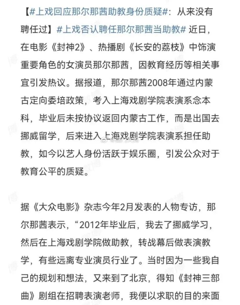另据《大众电影》杂志今年2月发表的人物专访,那尔那茜表示,“2012年毕业后,我去了挪威学习,然后在上海戏剧学院做助教,转战幕后做表演教学,有些远离专业演员行业了。当时因为一些我自己的规划和想法,又来到了北京,得知《封神三部曲》剧组在招聘表演老师,我便以求职的目的来面试了。”