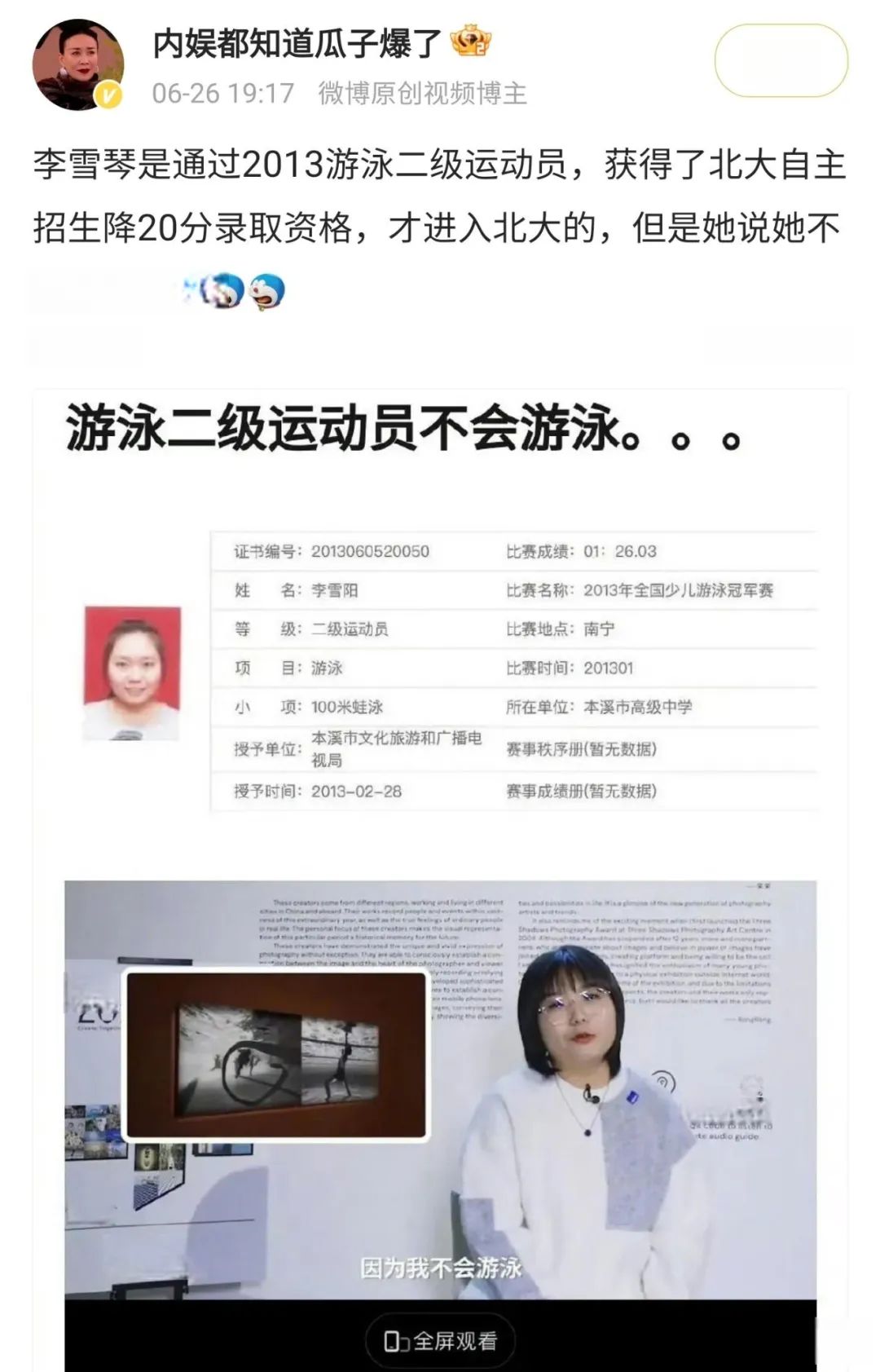 李雪琴曾在访谈中提及凭借游泳二级运动员身份获得高考加分,却被网友质疑其游泳能力;