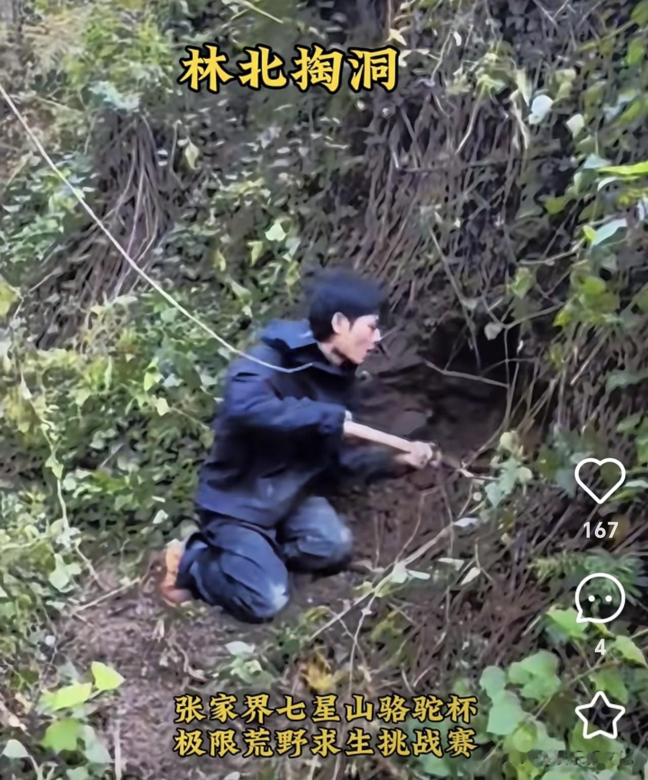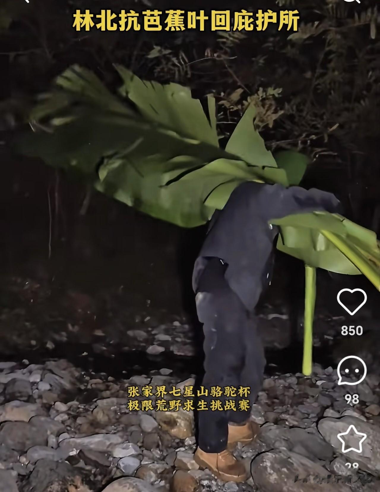 开赛第一天,林北又给网友贡献了不少笑点。别人的衣服都还是干干净净,他又搞得一身泥土。洞还没挖好,他只好扛了几张大大的芭蕉叶回去挡风。