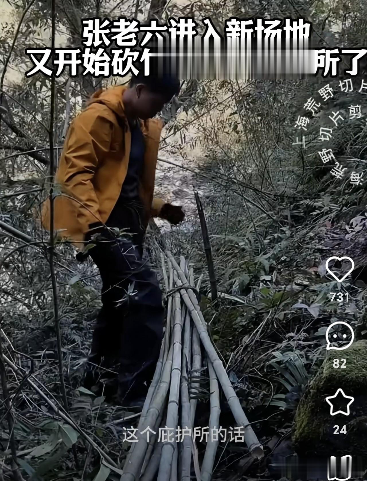 三号种子选手,张老六。张老六今天做好了去火工具,还没有生火成功,不过,他做了一张“豪华席梦思”床。用几根粗壮的木头拼在一起,上面铺满干燥的松针、树叶等,下面还悬空的,这样就不怕潮湿了。不过,张老六已经砍好了竹子,明天就可以开始建他的豪华“大别墅”了。
