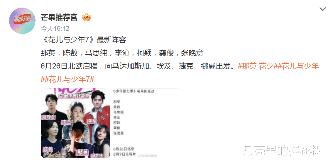 6月4日芒果推荐官发了微博,正式公布了花少7的阵容名单,这条微博写得简洁明了,直接把那英、陈数、马思纯、李沁、柯颖、龚俊、张晚意七人名单甩出来,网友一看就懂,评论区炸了锅,都说“阵容炸裂”。