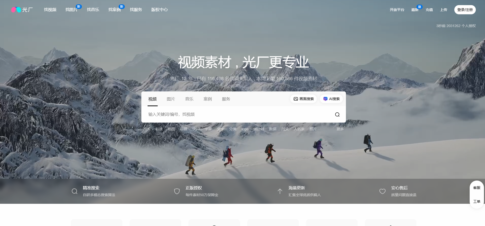 一、光厂:国内创作者的本土化高清素材库全面介绍:光厂成立于2012年,是国内领先的数字创意素材平台,聚焦高清图片与视频资源。平台累计收录超3亿张本土化图片,其中4K/8K超高清素材占比达45%,覆盖城市街景、民俗文化、商业场景等细分领域。核心功能包括AI智能搜索(支持“场景+风格”精准匹配)、分层预览(PSD文件可在线调整元素)及一站式版权保障,商用授权附带电子证书,规避法律风险。用户案例:教育博主“李老师课堂”通过光厂获取“实验室+童趣插画”组合素材,制作科普视频后完播率提升30%,粉丝互动量翻倍。行业适配标签:✅教育类 ✅企业培训 ✅知识科普 ✅文旅宣传