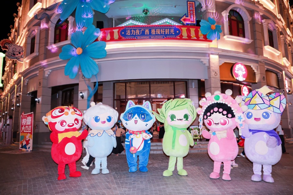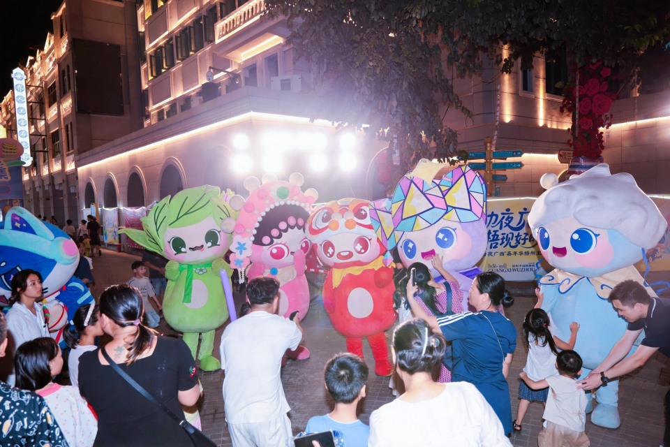 与此同时,“活力夜广西”官方IP形象“喵小桂”以及梧州市文旅吉祥物“梧骑骑”“茶宝宝”等穿梭其间,与游客亲切互动、合影留念,掀起打卡热潮。