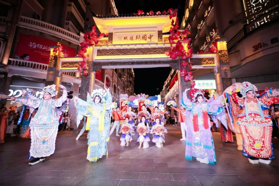骑楼城牌坊前,极具梧州特色的岭南风情快闪秀拉开了活动的序幕。“茶萝娘”“醒狮”等闪现骑楼城,共同演绎歌舞快闪,展现六堡茶文化和特色非遗魅力,再现“百年商埠”繁华景象。继续深入流光溢彩的骑楼城,器乐演奏、舞蹈表演、歌曲演唱等演艺节目接连上演,串联起骑楼城内多个节点,营造出“一步一景、步移景异”的流动画卷。